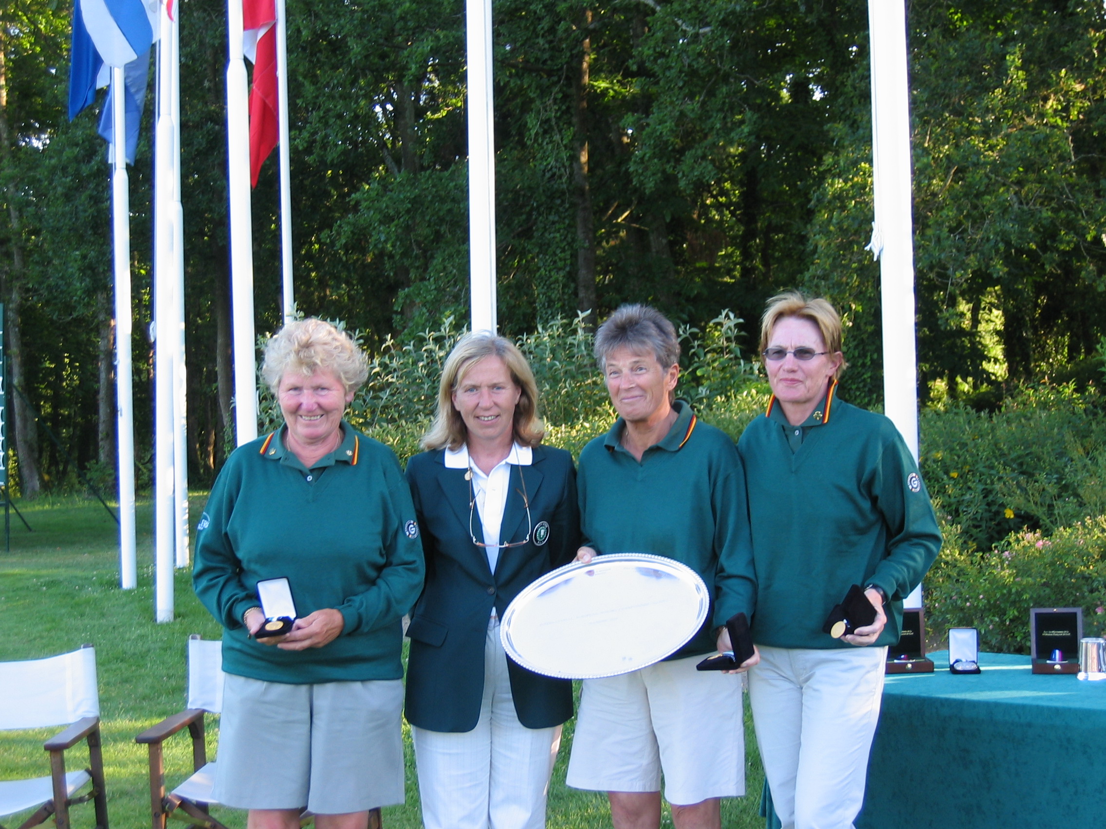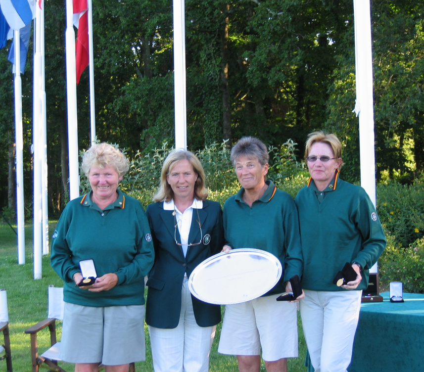 Marie-Christine Ubald-Bocquet, EGA Championship Committee handing over Trophy to winning team of Germany composed of Edeltraud Jacob, Rita Ruland and Erika Annison