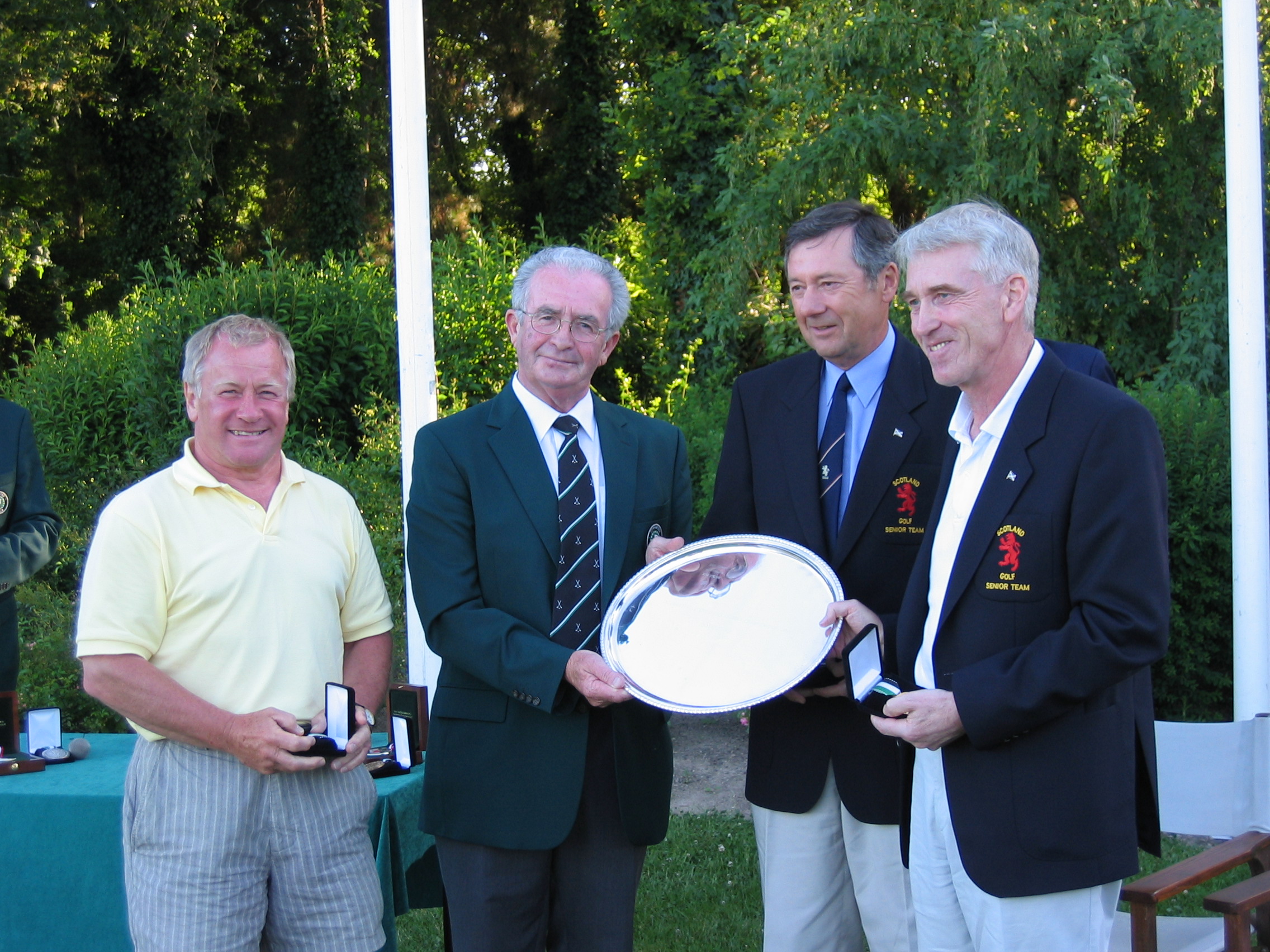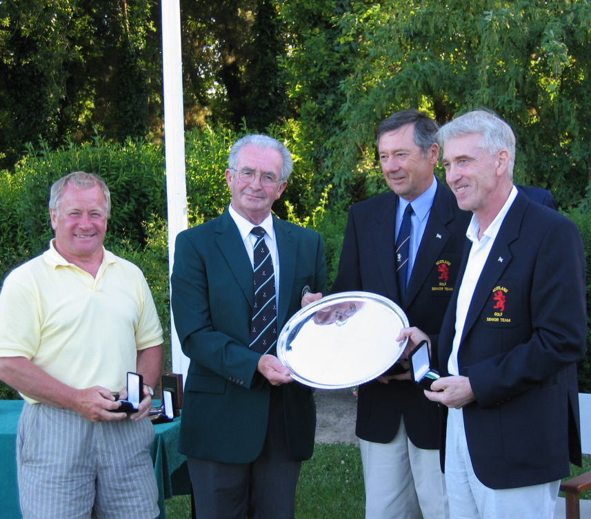 Jack Lynch, EGA Executive Committee, handing over Trophy to winning team of Scotland composed of Harvey Brown, Brian Grieve and David J. Smith