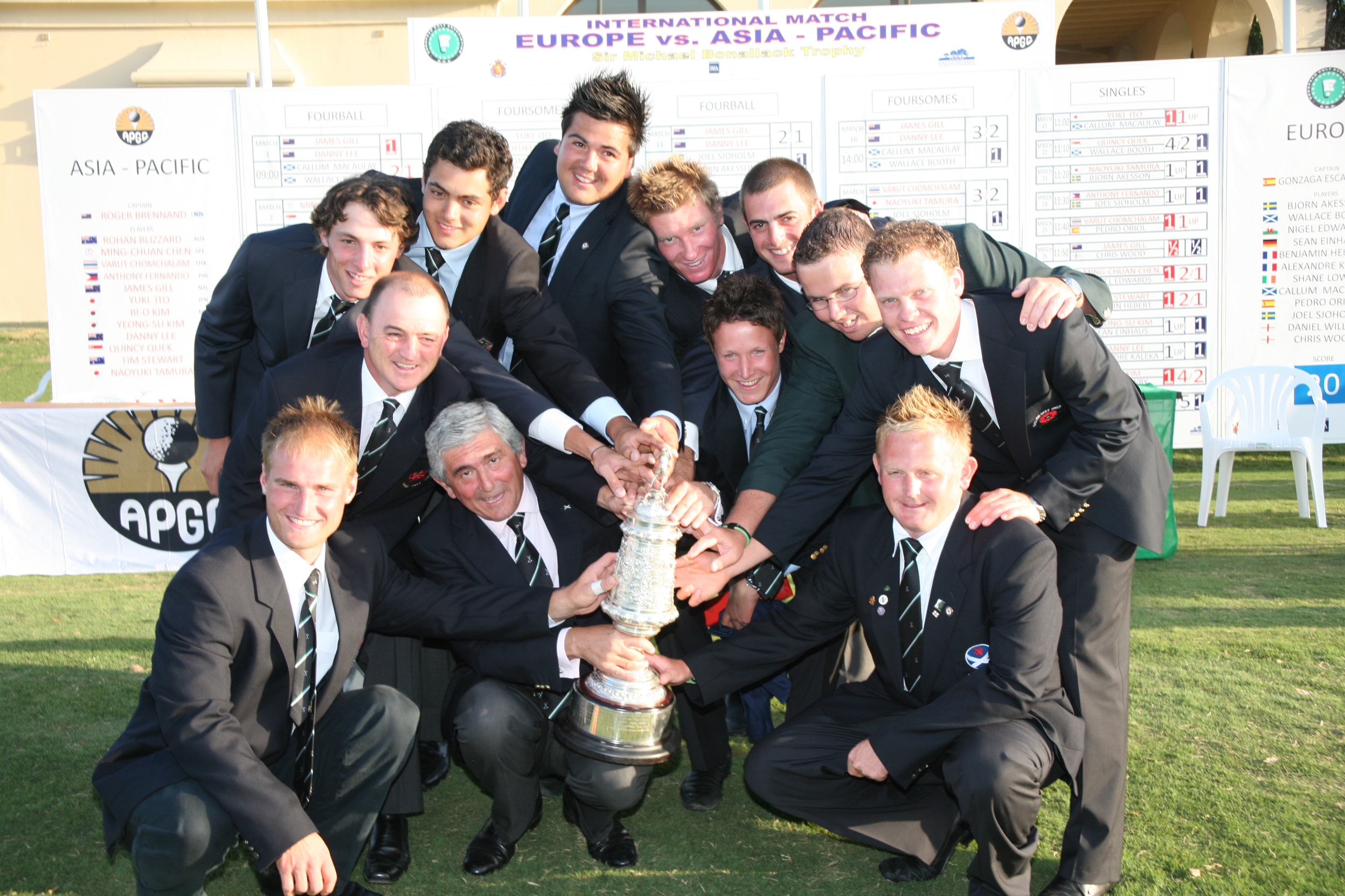 European captain, Gonzaga Escauriaza of Spain, had coached his players well on his home turf and had given them an in-depth strategy to play the demanding Valderrama course. No more useful could his advice have been than on the 18th hole - a tough par 4 dogleg left with a tee-shot landing area requiring pin-point precision. Following Booth's 4/2 win, Akesson stole his match from Naoyuki Tamura (Japan) on the final hole after being down most of the day. Sjoholm did the same after trailing Anthony Fernando (Philippines) for the final few holes to seal the European team's victory. In fact, of the 32 matches, 15 were to finish on the 18th hole - an indication that the final 20-12 result was much closer than it may seem.