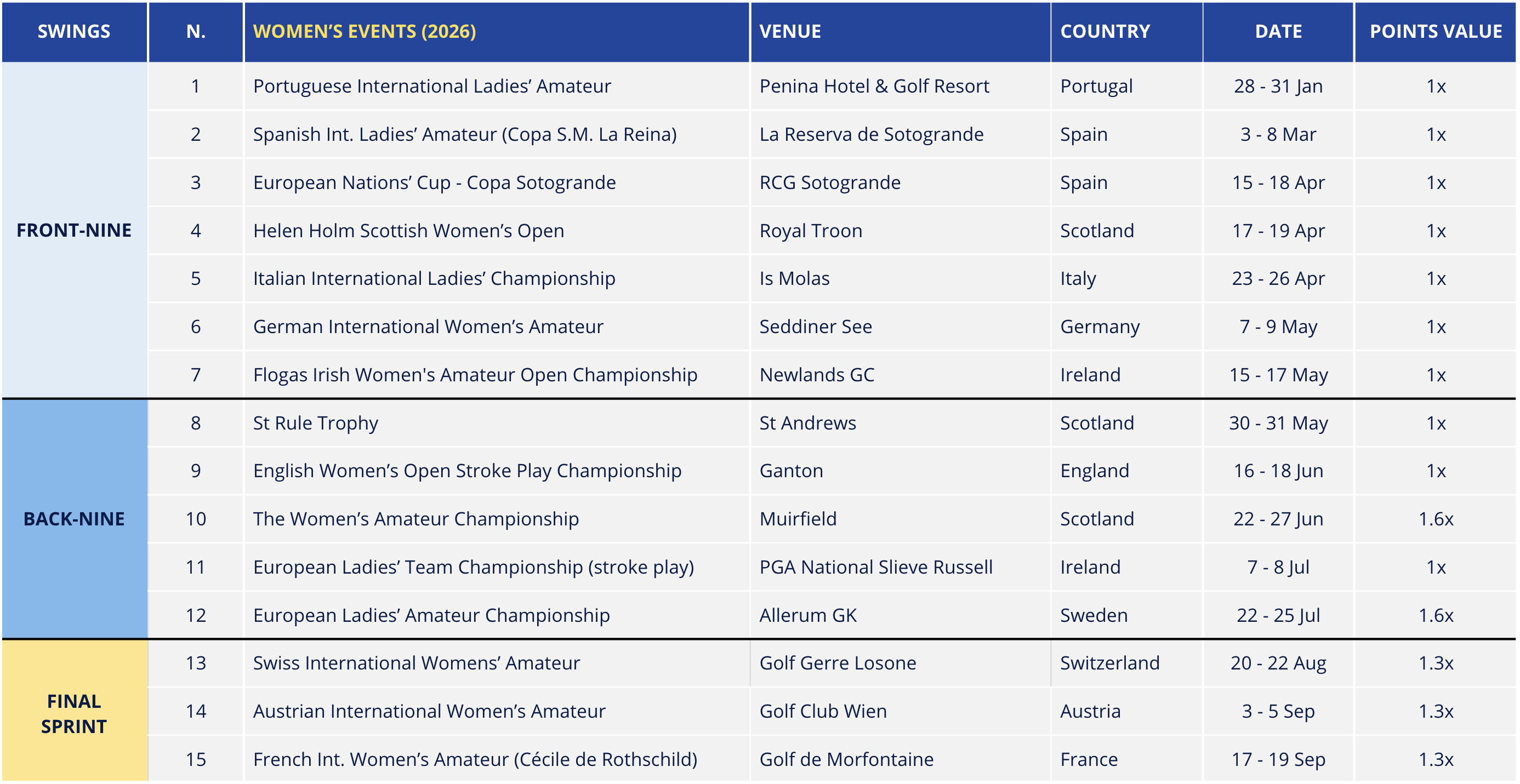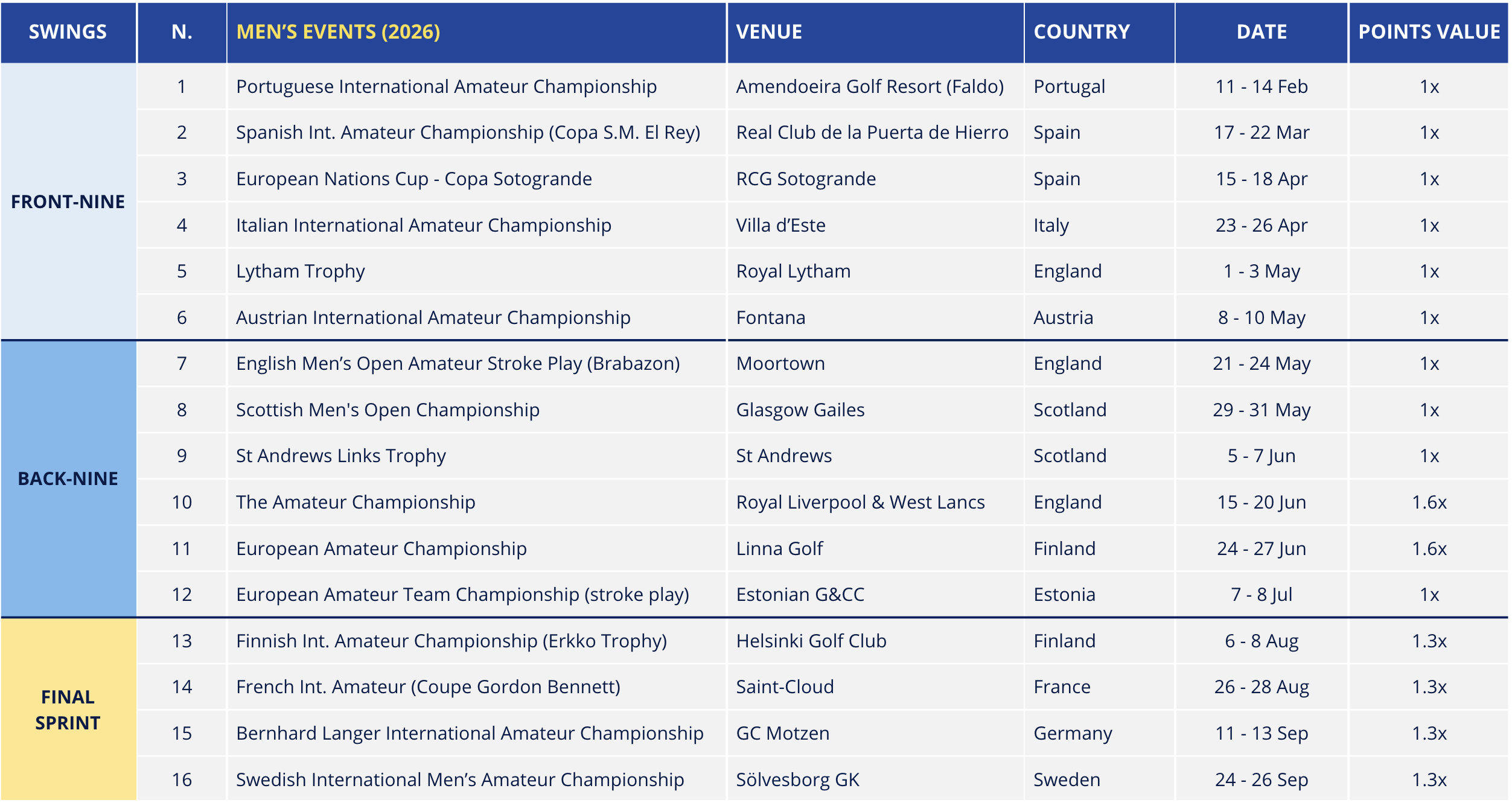 The European Amateur Order of Merit (EAOM), launching with a pilot season in 2026, was created by the EGA and its member federations with the objective of improving the landscape of elite amateur golf in Europe.