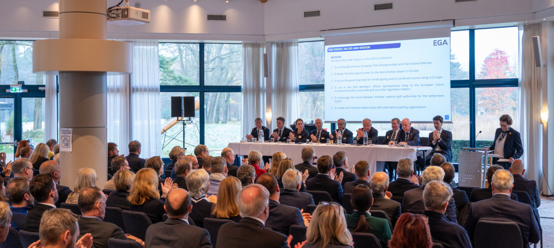 The assembly heard reports from several officials on the EGA’s activities in the past year, including Yves Hofstetter on championships, Jan Visser on handicapping and course rating, Gunnar Håkansson on Environmental Sustainability, and Benoit Dumont on the association’s finances. Grant Moir, Executive Director of Governance at The R&A, also presented to delegates with updates from the St Andrews-based organisation.