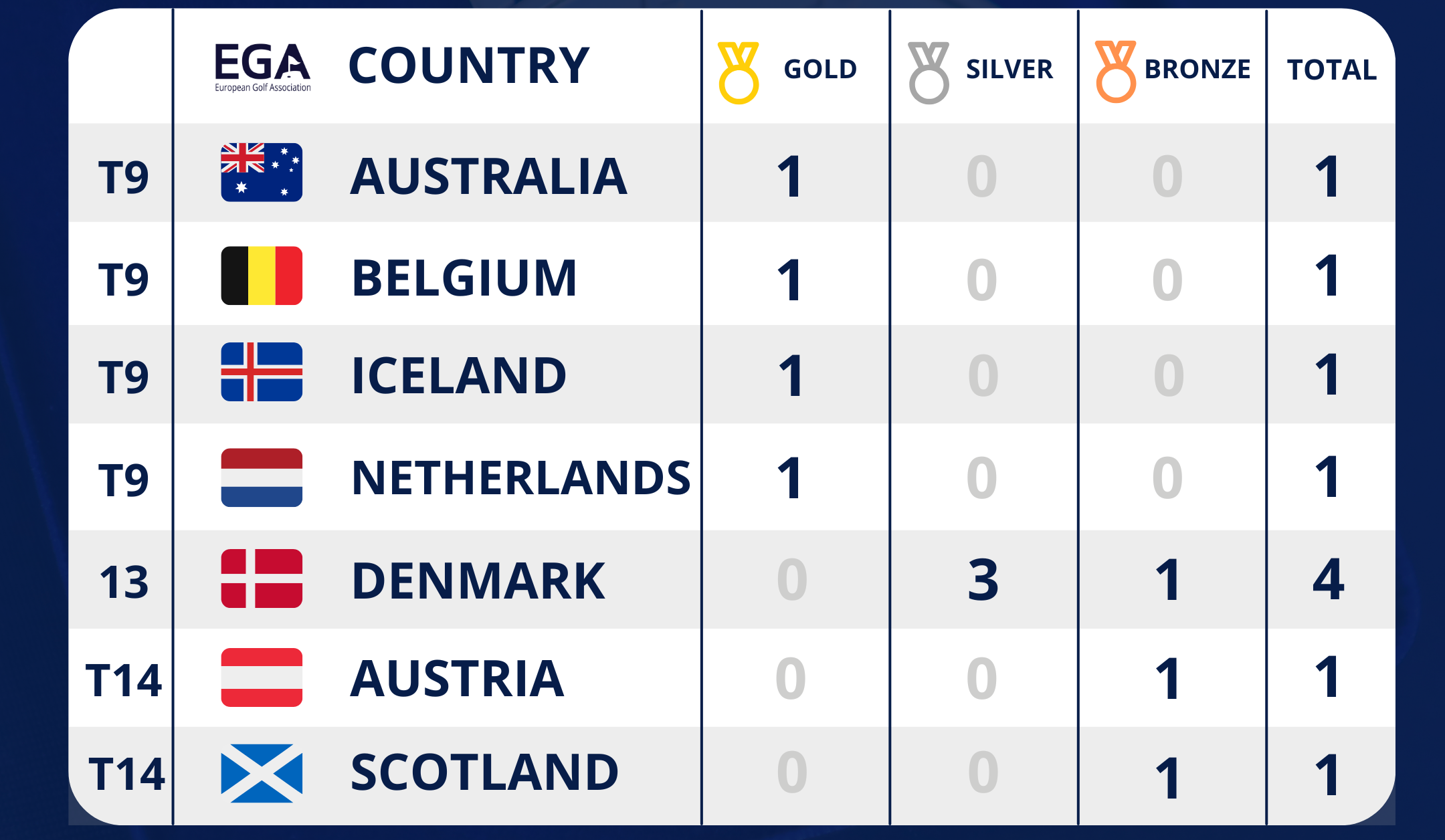 By the end of September and with just two EGA events to play, England were top of the European Medal Table. Having won two gold medals of their own - at the European Ladies' Team Championship and European Senior Men's Championship - England were ahead of France with more silver medals won.
